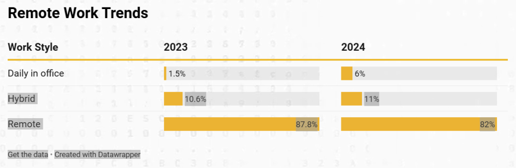 作為年度區塊鏈薪酬調查的一部分,我們收集了產業內工作場所安排的數據。以下是 2024 年與 2023 年相比的工作偏好和趨勢。