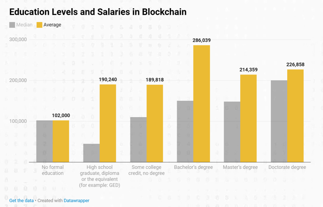 今年我們研究了產業內的教育背景,發現了一些有趣的結果。對區塊鏈專業人士教育水平的分析揭示了關於繼續教育經濟回報的趨勢:
