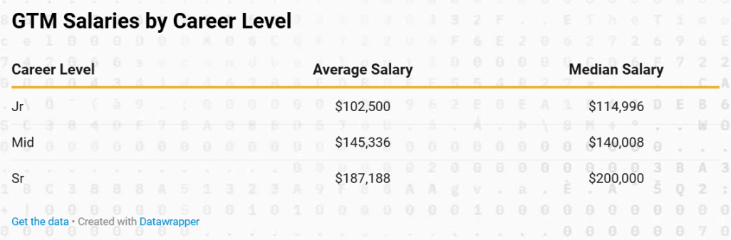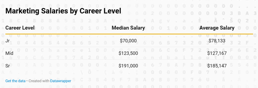 從職業級別來看,初級市場行銷人員的中位數基本薪資為 70,000 美元,平均為 78,133 美元。中級專業人士的中位數為 123,500 美元,平均為 127,167 美元,而高級市場行銷職位的中位數為 191,000 美元,平均為 185,147 美元。