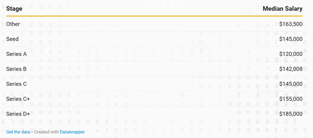 從公司階段來看,種子階段組織的中位數薪資為 145,000 美元,A 輪公司略降至 120,000 美元。B 輪公司的中位數為 142,008 美元,C 輪回升至 145,000 美元。薪資在 C 輪及以上階段繼續增長,C 輪 + 為 155,000 美元,D 輪 + 為 185,000 美元。所有階段的綜合中位數薪資為 140,000 美元,總體平均為 145,725 美元。