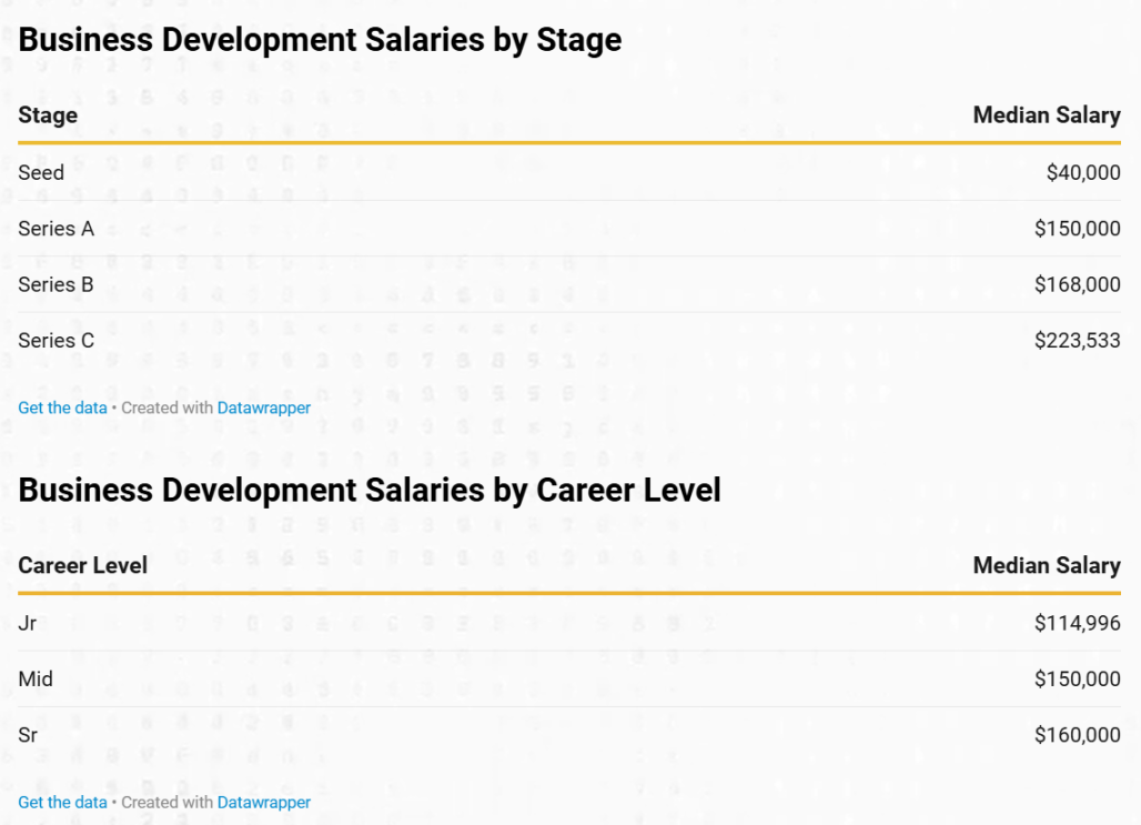 業務發展職位的基本薪資在公司階段和職業級別上均有顯著增長。種子階段的中位數基本薪資為 40,000 美元,A 輪升至 150,000 美元,B 輪為 168,000 美元,C 輪為 223,533 美元。從職業發展來看,初級職位的中位數為 114,996 美元,中級為 150,000 美元,高級為 160,000 美元。