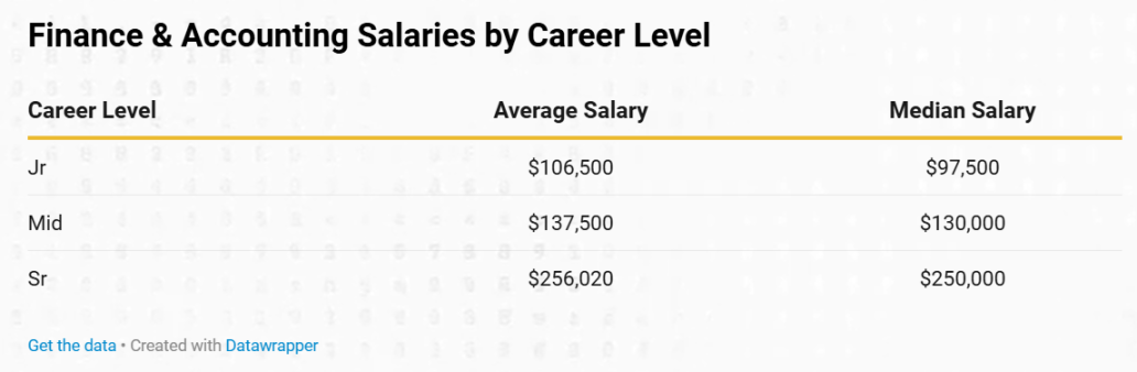 2024 年初級財務與會計職位的平均薪資為 106,500 美元,中位數為 97,500 美元。中級職位的平均為 137,500 美元,中位數為 135,000 美元,高級職位的平均為 256,020 美元,中位數為 250,000 美元。這些數據清晰地展示了隨著經驗和職位的晉升,薪酬逐步提升。