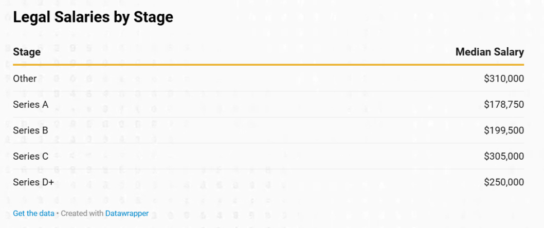 法律職位的薪酬通常隨著公司融資階段的推進而增長。在 A 輪階段,中位數基本薪資為 178,750 美元,B 輪升至 199,500 美元。到 C 輪階段,法律專業人士的薪資顯著增長至 305,000 美元。這些數據展示了法律職位薪酬如何與公司的成長和成熟同步增長。