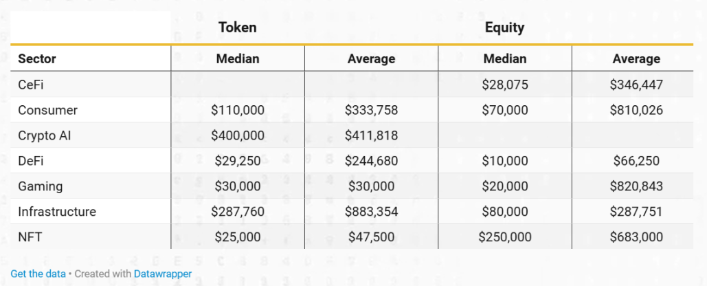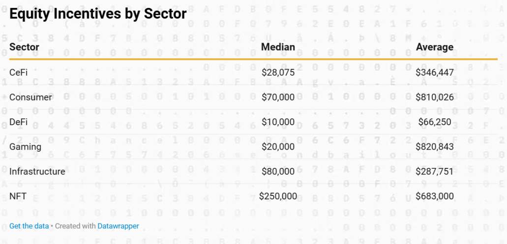 中位數股權激勵因領域而異。DeFi 專案最低,為 10,000 美元,CeFi 為 28,075 美元,遊戲為 20,000 美元。以消費者為中心的領域為 70,000 美元,基礎設施為 80,000 美元。NFT 領域的中位數股權激勵最高,達到 250,000 美元。
