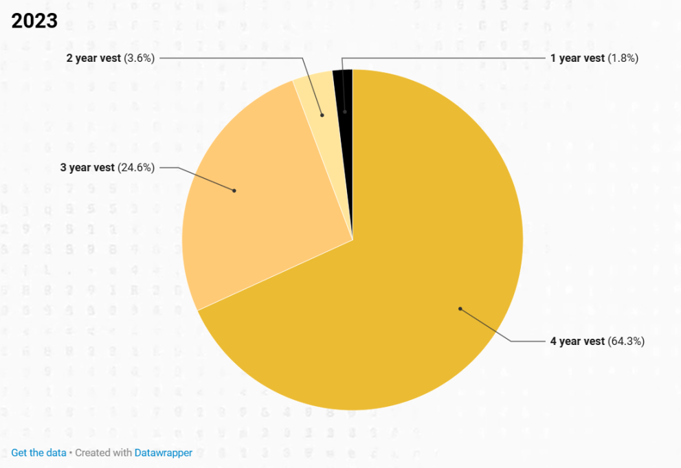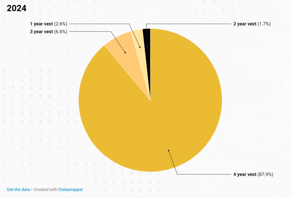 絕大多數代幣鎖倉期為四年,2023 年佔 64.3%,2024 年上升至 87.85%。相比之下,較短的鎖倉期(一年、兩年或三年)佔比較小。2023 年,它們在 1.80% 至 24.60% 之間,2024 年在 1.72% 至 6.58% 之間。這一數據表明市場明顯偏好較長的鎖倉期,尤其是在 2024 年。