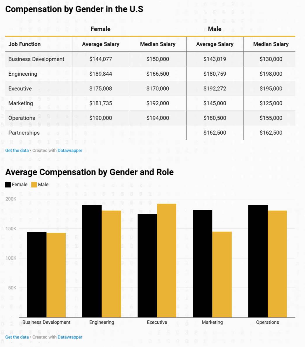 「美國全職女性加密貨幣員工的中位數薪資比男性高約 14%,但這一差異可能由多種因素導致。產業內的女性通常擁有更多工作經驗,這可能解釋了部分薪資差異。此外,雖然統計意義不顯著,但女性更常從事行政和營運類職位,這些職位的基本薪資通常低於技術和非高階主管職位。然而,女性在高薪管理職位中的比例也可能更高,這可能導致初始基本薪資较高。但長期來看,男性可能因更多接觸股權或代幣補償而獲得更高收入。男性在加密領域更積極地爭取股權或代幣補償,通常導致基本薪資較低但長期收入潛力更大。不過,由於額外薪酬數據的變異性,很難對性別間的總收入差異得出明確結論。」