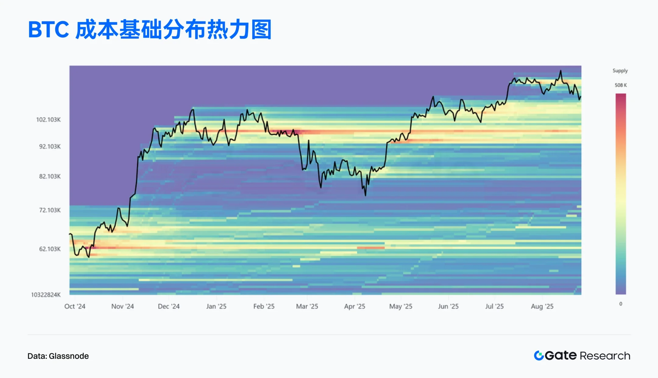 據 Glassnode 數據,BTC 的成本基礎分布熱力圖顯示,在 93,000–110,000 美元區間形成了明顯的供給密集帶,自 2024 年 12 月以來持續累積,逐漸成為當前市場的重要支撐區域。近期價格雖從 124,000 美元高點回落,但整體仍運行在這一供給帶上方,顯示出較強的承接力。【10】