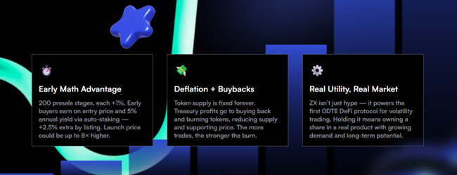 儘管這些主流幣種前景看好,Zexpire 此類代幣也吸引越來越多的市場關注。官方表示該平台將市場波動性本身,轉化為一條簡單的獲利途徑,用戶只需一鍵預測比特幣在 24 小時內將維持區間震盪或實現突破。損失有上限,無清算,無追加保證金。每一次交易都由 $ZX 代幣驅動,其費用回饋和自動回購機制建立了穩定的需求。