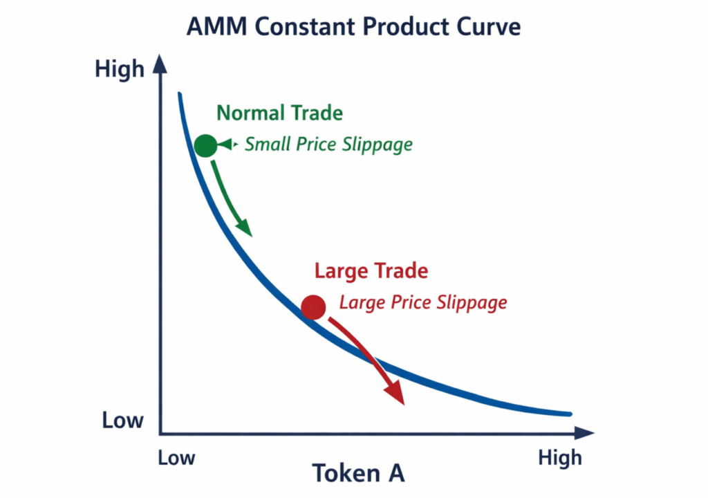 去中心化交易所的流動性是由「自動做市商」(AMM)提供的。AMM 的定價公式:最常見的是恆定乘積公式 x × y = k。意味著當你買入的量越大,價格滑動就越劇烈。這不是線性的,而是指數級的。