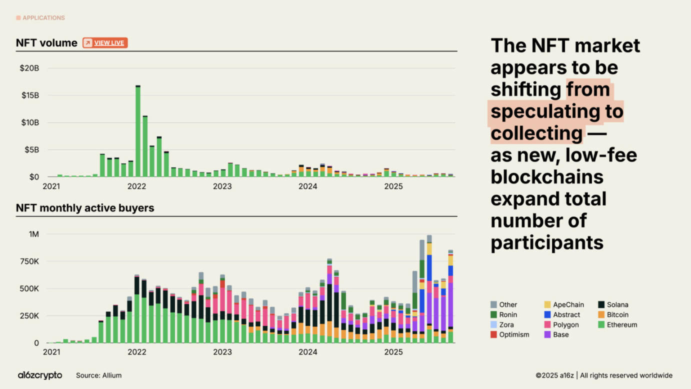 NFT(非同質化代幣)市場交易量雖遠未達到 2022 年的峰值,但月活躍買家數量持續增長。這一趨勢表明,消費者行為正從投機轉向收藏。 這一轉變的背後,是 Solana、Base 等公鏈低成本區塊空間的普及。