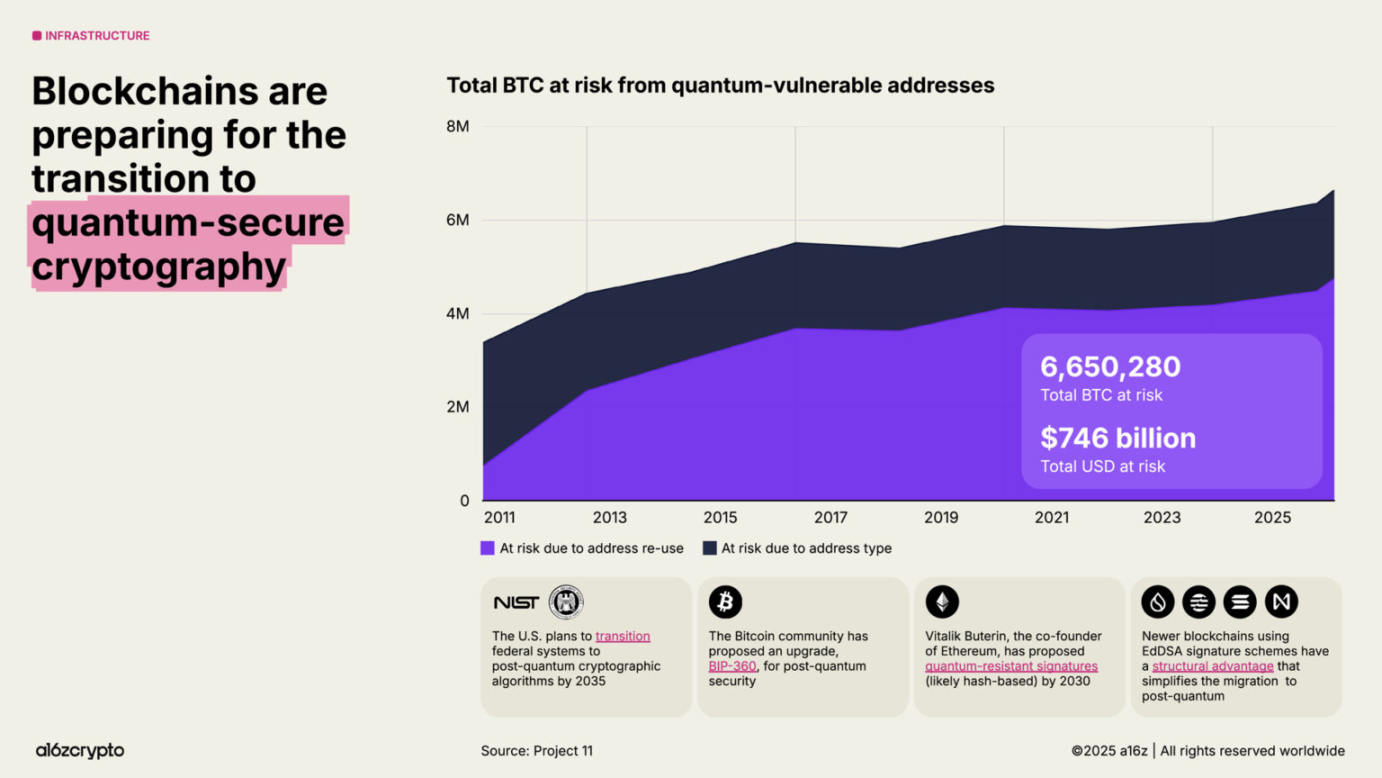與此同時,區塊鏈正加速推進 「後量子計算」 準備工作。目前,約 7500 億美元的比特幣儲存在易受未來量子攻擊的地址中;美國政府計畫在 2035 年前,將聯邦系統遷移至後量子加密演算法。