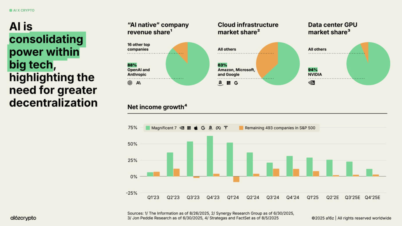 當前,AI 的計算層正逐漸向少數科技巨頭集中,引發 「中心化」 與 「審查風險」 擔憂。OpenAI 和 Anthropic 兩家公司控制著「人工智慧原生」公司 88% 的收入。亞馬遜、微軟和 Google 控制著 63% 的雲端基礎設施市場,而英偉達則占據了 94% 的資料中心 GPU 市場。這些失衡推動了「七巨頭」在過去幾年中實現了兩位數的季度淨收入增長,而標普其餘 493 家公司的整體盈利增長卻未能跑贏通膨。