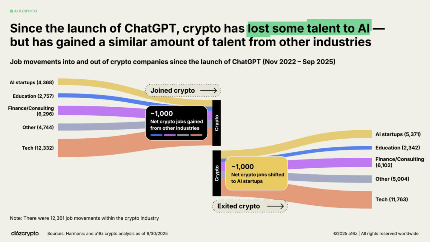 在人工智慧熱潮的帶動下,一些開發者放棄了加密貨幣領域。我們的分析表明,自 ChatGPT 推出以來,約有 1,000 個工作崗位從加密貨幣領域轉向了人工智慧。但這一數字被同樣數量的開發者從其他領域(例如傳統金融和科技)加入加密貨幣領域所抵消。