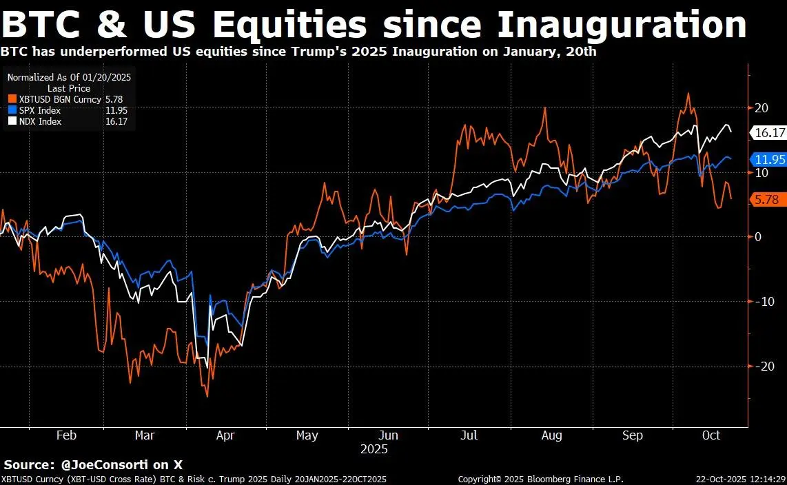 上圖顯示,自 2025 年川普就職以來,比特幣的表現遠遜於美國股市。那斯達克和標普 500 指數的漲幅領先比特幣超過 100%,而比特幣的走勢相對平坦。