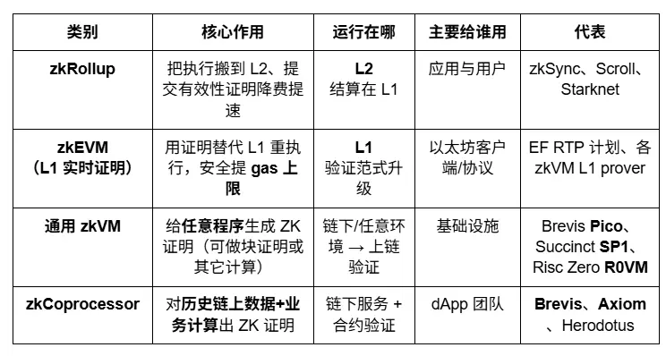 而在以太坊生態之外,零知識證明(ZKP)技術也延伸至更廣泛的通用可驗證計算(Verifiable Computing)領域,形成以 zkVM 與 zkCoprocessor 為核心的兩類技術體系。