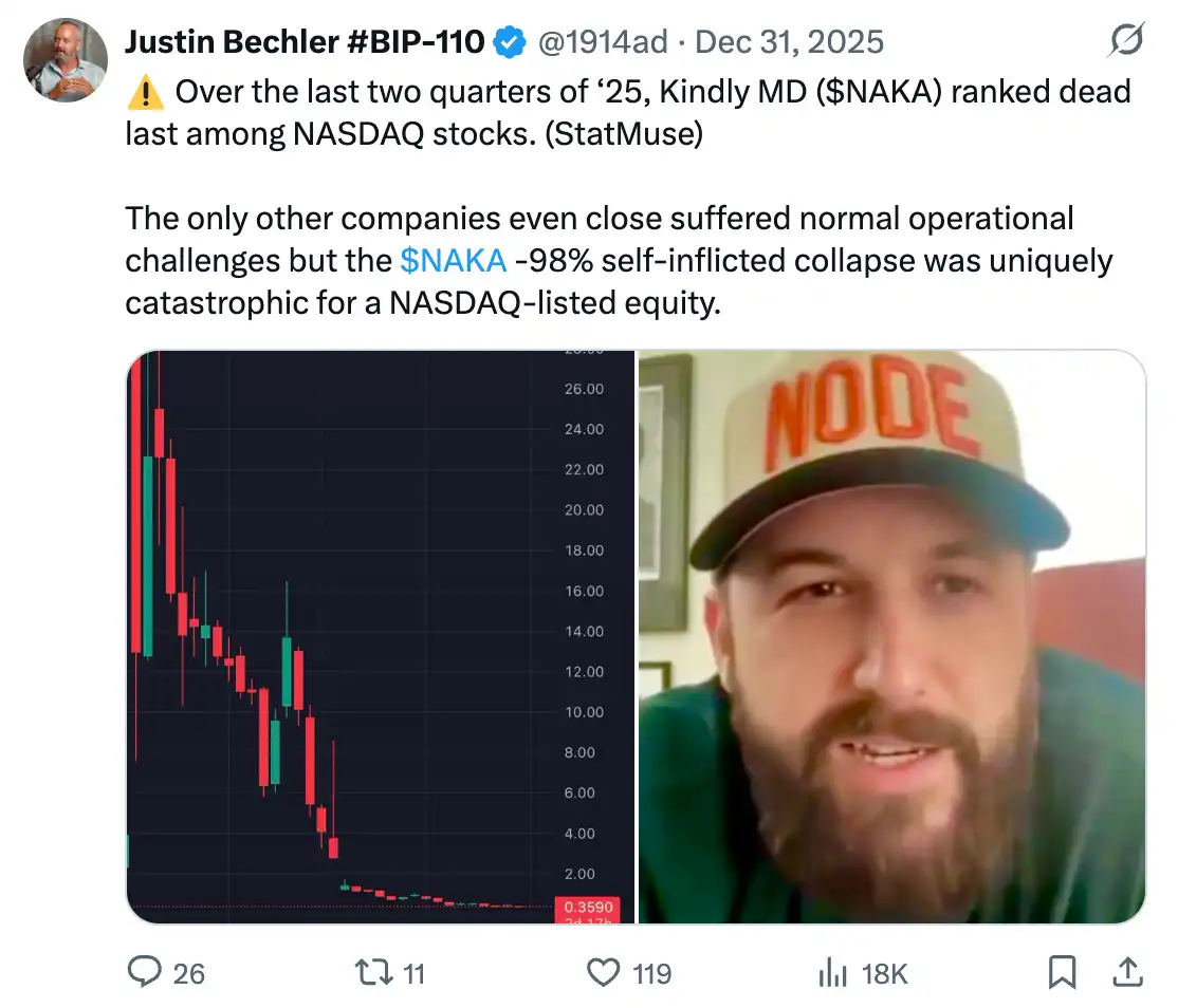 貝利創建了 Nakamoto Holdings。透過 KindlyMD 將其併入一個上市殼公司,在此過程中籌集了 7.1 億美元。在散戶的熱情推動下,股價被炒到 NAV 的 23 倍。PIPE 投資者以 1.12 美元入場,而公眾支付的價格是這個數字的 20 到 30 倍。股價隨後暴跌 99%。