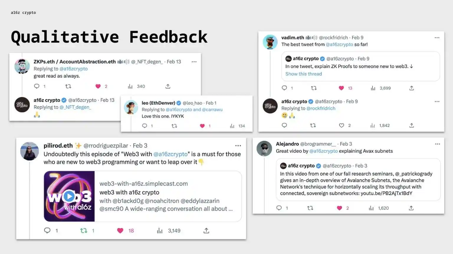 ・吸引分享和回覆:將社群管理的思路更進一步,建立易於討論的帖子。提出問題(「你最喜歡的加密貨幣表情包是什麼?」)、建立策劃列表(「零知識證明的 10 個必備資源」)、徵求意見(「你會如何向一個對加密貨幣不熟悉的人解釋 web3?」)。