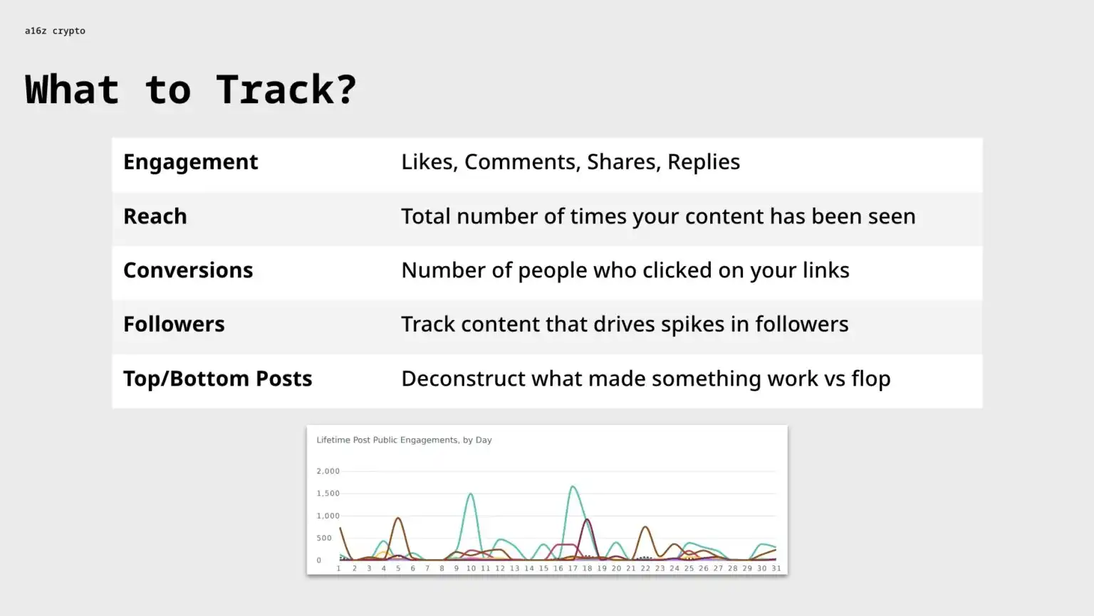 團隊還可以使用 Google Analytics、UTM 連結 和其他工具追蹤來自有機帖子(相對於付費廣告)的轉化,從點選到註冊或購買。但在早期階段,這種細緻程度通常是可有可無的,而非必要。