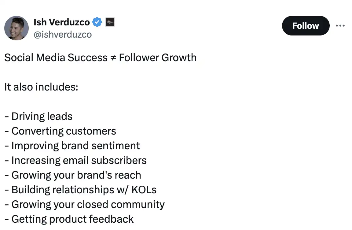 例如,無數企業依賴「影響者」的力量來傳播資訊。來自擁有廣泛網路和受信任品牌的人的分享,往往比來自小帳戶的數百次分享更具影響力。就像接觸到更高品質的潛在客戶,往往比接觸到對初創產品沒有需求的人更能顯著推動業務增長。在關注者增長時,問「我們是否接觸到合適的人」同樣重要(甚至更重要),而不僅僅是問「我們是否接觸到更多的人」。