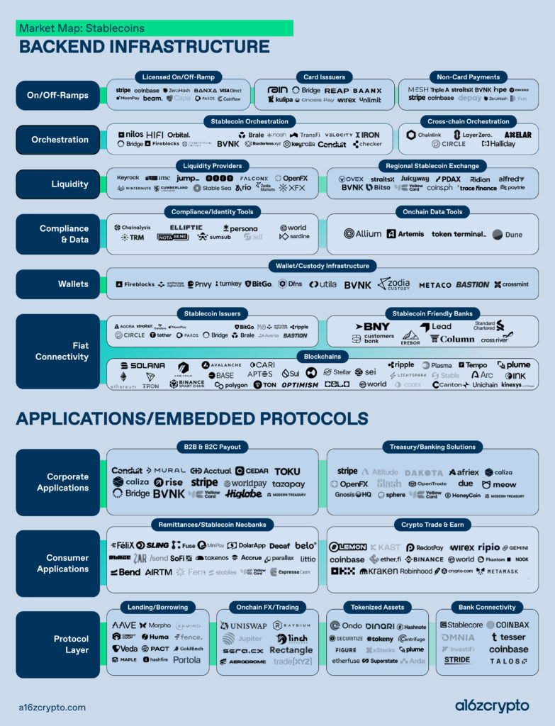 - 發行商的牌照肉搏戰:隨著美國《GENIUS 法案》的通過,穩定幣發行商正競相申請 OCC 國家信託牌照(National Trust Charter)。a16z 認為,搶下這張門票的贏家未來甚至可能直接接入聯準會(Fed)系統,成為全球金融體系的絕對核心。