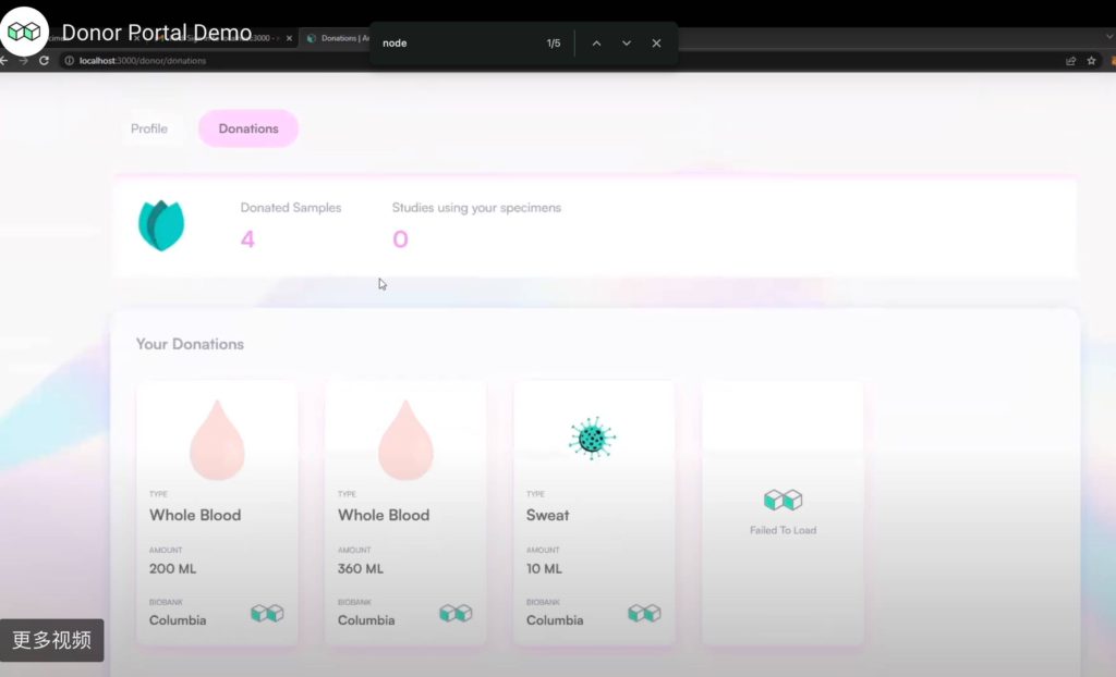 比如下圖 Demo 中,患者不同時期貢獻的血液和汗液等資料,都可以在一個管理臺中看到,同時樣本的使用情況和流向也在區塊鏈(L2)上得到追溯。