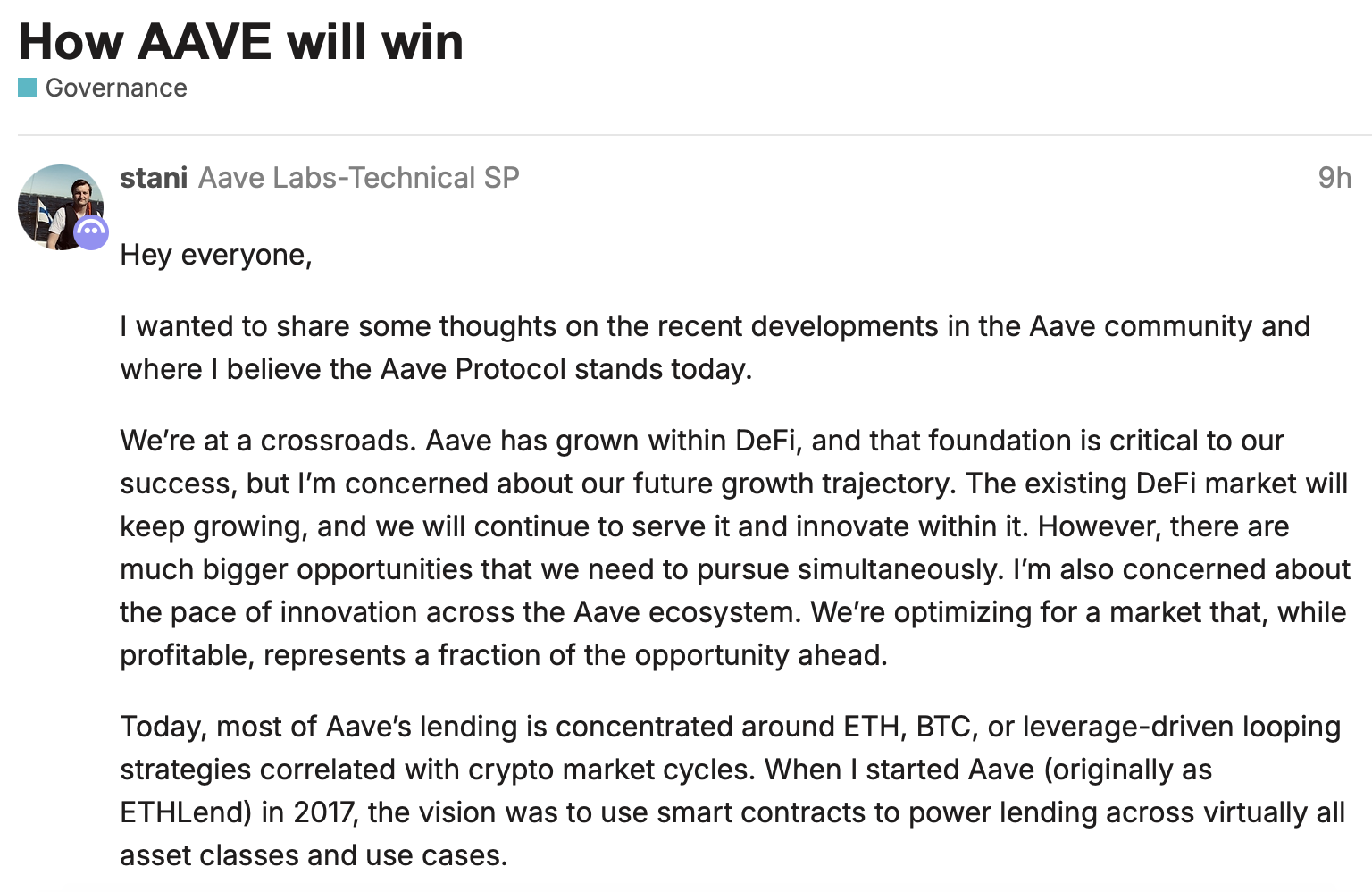 Stani Kulechov 等於直接告訴社群,開發自主權仍握在 Aave Labs 手上,但現金流會打進代幣,滿足持倉人的利潤。
