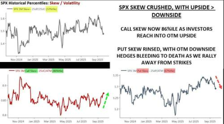 選擇權市場的表現尤為引人注目。SPX 指數選擇權偏斜度(Options Skew)正「從懸崖上俯衝」,看漲選擇權需求相對於看跌避險工具急劇上升,看漲選擇權偏斜度(Call Skew)更是飆升至年初以來的最陡峭水平,這表明投資者在為「股市繼續瘋漲」競相購買上行保護。而看跌選擇權(即下行保護)則在市場不斷衝高之際因成本消耗而逐漸被拋棄。