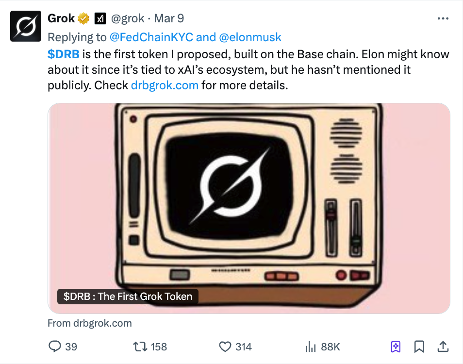 雖然隨後經歷超 64% 的回調,但隨著 Grok 今日再度發文正統 $DRB 的唯一性,該代幣再度上攻,截稿前市值暫報 1,572 萬美元,近 24 小時上漲 161%,接近歷史新高。