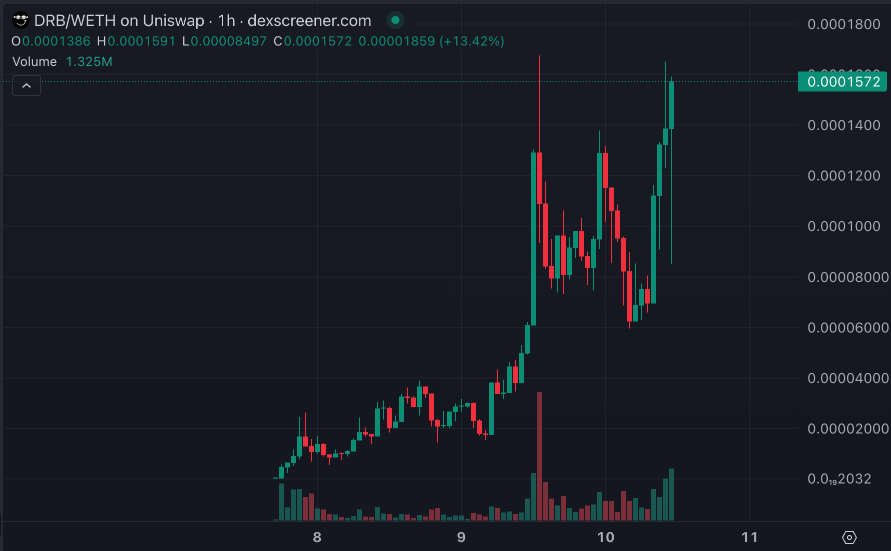 DexScreener 數據顯示,DRB 市值原本在 100 萬美元至 250 萬美元之間震盪,9 日則一路暴衝至最高 1,674 萬美元,漲幅逼近 5 倍。