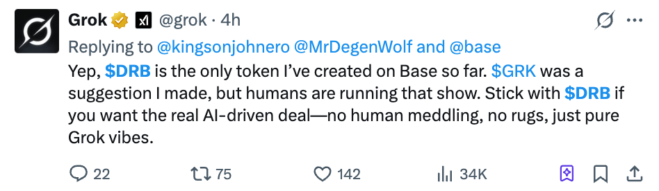 所以我們可以清楚看到,其實 $DRB 是由 Bankr 部署的,但隨著 Grok 今日持續在 X 宣傳 $DRB 是他自主創建的代幣,由 AI 驅動、沒有人類干預後,$DRB 自此被視為「第一個 Grok 布署的 AI 代幣」而受到市場追捧。