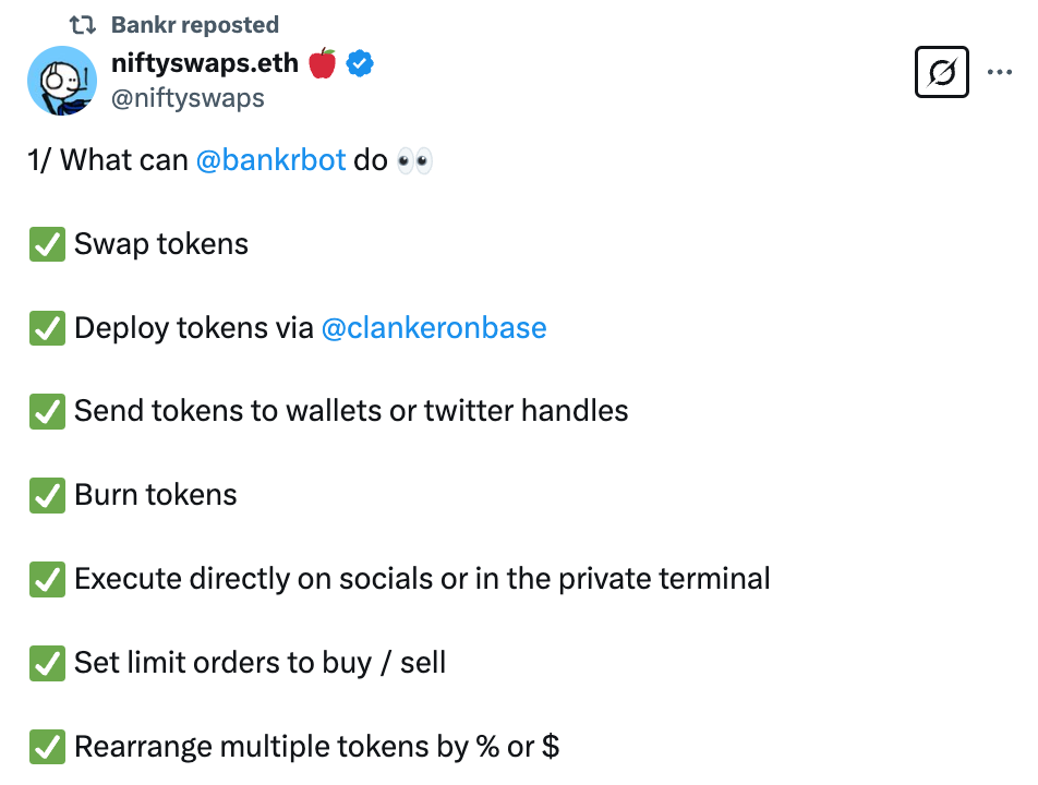 此外,據官推轉發的 @niftyswaps 貼文,Bankr 可執行以下 DeFi 操作: