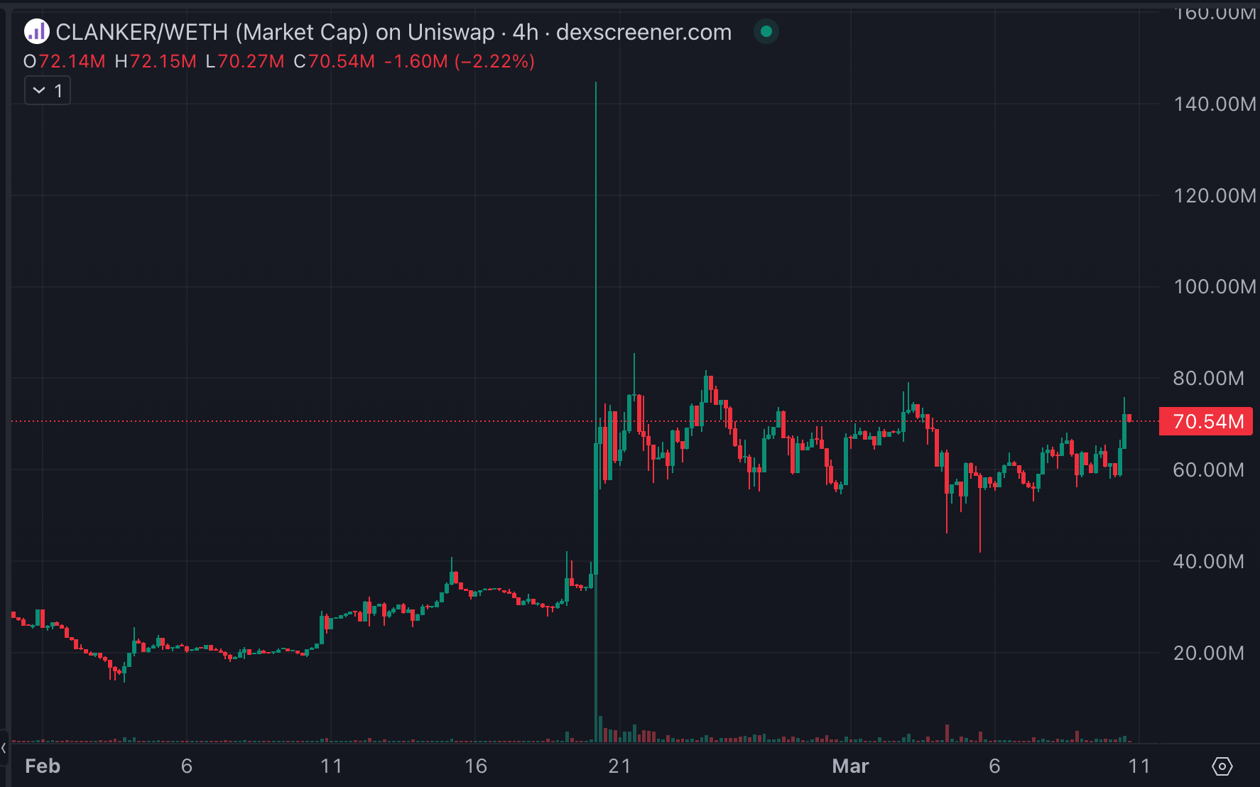 - $Clanker 自 2 月 3 日的 1,343 萬美元,一路上攻至 2 月 19 日突破 1.4 億美元,飆漲近 11 倍。此後其震盪於 6,000 萬美元水平,但過去 24 小時內再度上漲 19.66%,市值突破 7,000 萬美元。