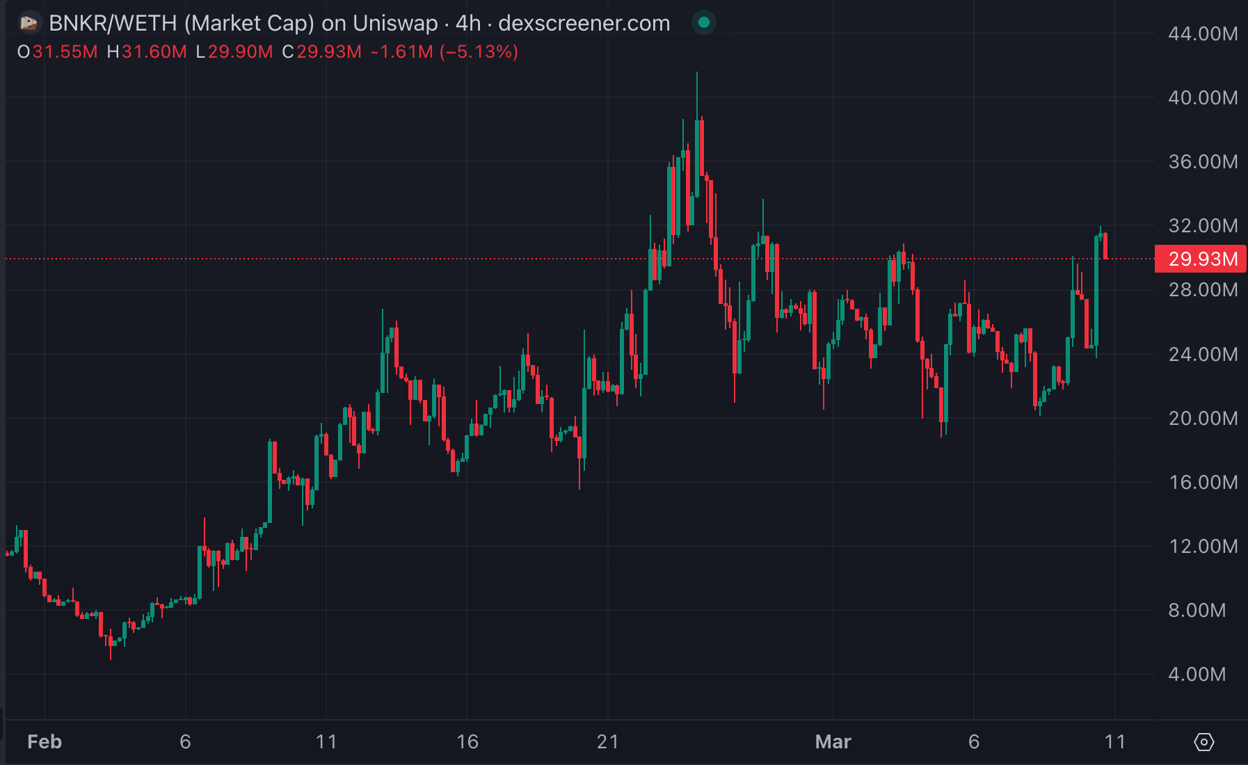 - $BNKR 自 2 月 3 日的 486 萬美元市值,至 2 月 23 日衝上 4,159 萬美元市值,累計漲幅高達 756%。如今 $BNKR 自 3 月 8 日的 2,012 萬美元,飆漲至今日最高 3,198 萬美元,3 天內便大漲 58.94%。
