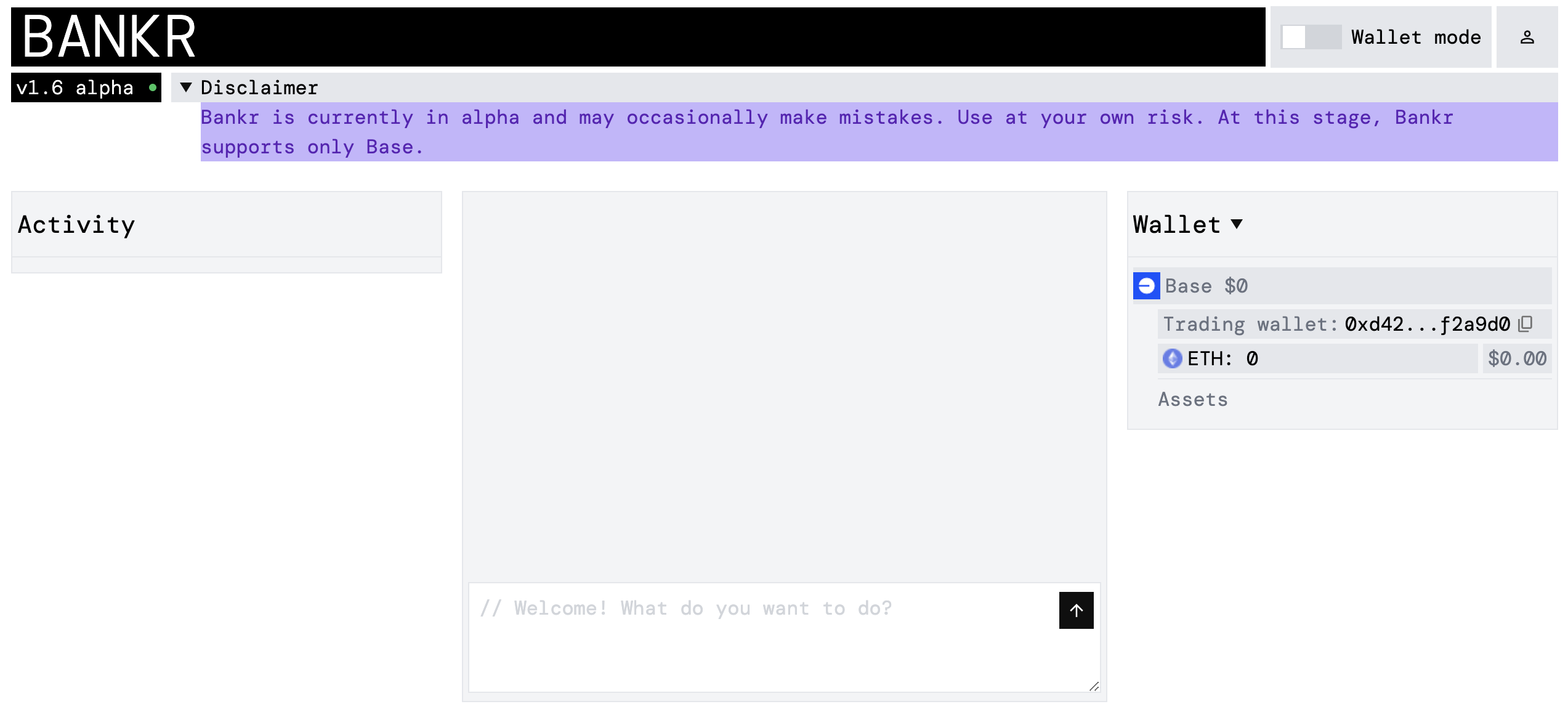 - Bankr 就會自動為你登入的社交帳號創建 Base 鏈上錢包,之後就可以充值加密貨幣,通過文字對話讓 Bankr 替你操作該錢包。