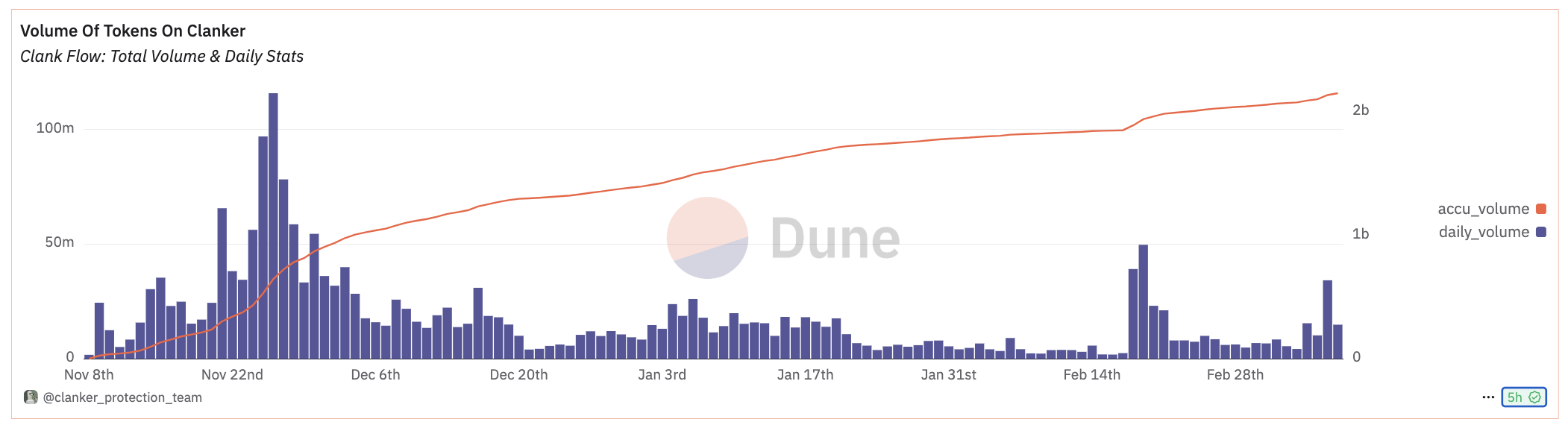 所有由 Clanker 部署的代幣均可在 clanker.world 追蹤。根據 Dune 數據,Clanker 生態代幣交易量在 2 月中旬與近兩日迎來強勁復甦,這一趨勢與 $CLANKER 的漲勢高度吻合,可作為 $CLANKER 未來走勢的參考指標。