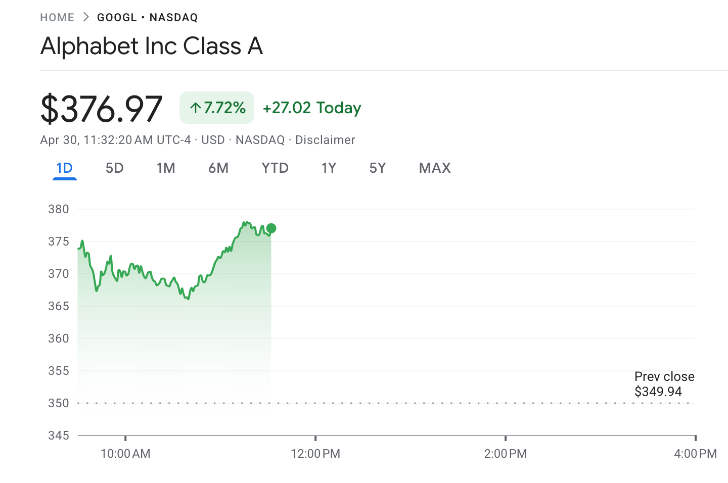 - A 類股(GOOGL):盤中一度暴漲超過 7%,最高觸及 378.22 美元。這個數字遠遠超越了幾天前(4 月 27 日)剛寫下的前次歷史高點 350.34 美元。