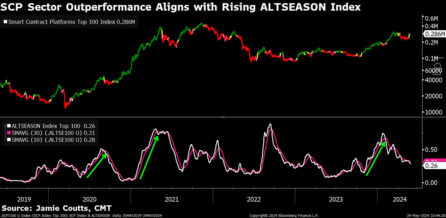 在此背景下,前彭博分析師 Jamie Coutts 今日在 X 平台發推表示,他利用智慧合約平台指數(Smart Contract Platforms,SCP)、山寨季指數(Altseason index)、美國總統大選和流動性週期等因素,作為判斷基準,判斷山寨季訊號預計會在未來幾週內出現。