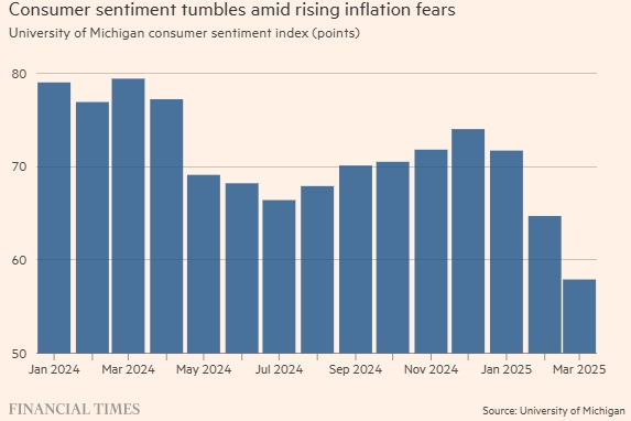 數據上也顯示消費者信心下滑,進一步影響市場情緒。根據密西根大學最新的消費者信心指數,美國消費者信心已連續三個月下降,來到 2022 年 11 月以來的最低水準。這反映出美國家庭對未來經濟狀況的擔憂,也讓投資人更加擔心消費動能的減弱。