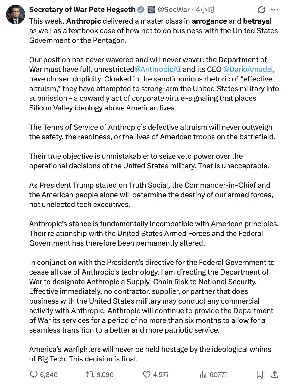國防部長 Pete Hegseth 給 Anthropic 的執行長 Dario Amodei 發出最後通牒:移除合約裡的使用限制,允許 Claude 被用於所有合法目的。否則,五角大廈將取消合約,並將 Anthropic 列為「供應鏈風險」。期限是當地時間 2 月 27 日下午。