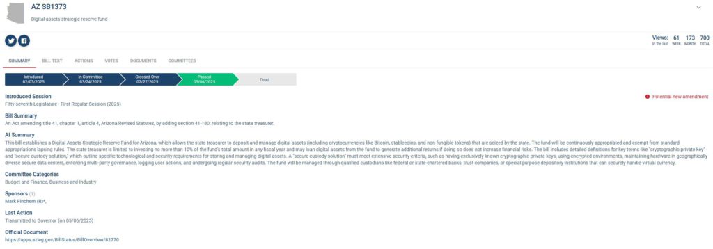 此外,亞利桑那州本身還有另一項類似的比特幣相關法案,即參議院法案 1373 (SB 1373) 正在等待州長 Hobbs 簽署。該法案一旦通過,將允許州財政部長將數位資產戰略儲備基金中最多 10% 的比例進行投資,以下是該法案概述: