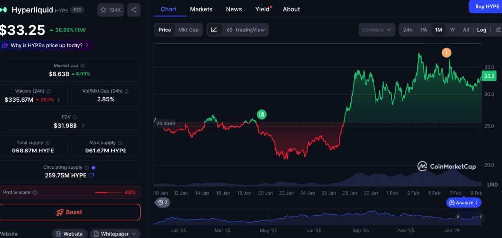 截至目前,HYPE 近一週上漲約 20%,近一月漲幅達 25%,持續在 32 至 33 美元區間交易,維持多頭格局。在 Hayes 與 Samani 的這場公開對賭中,市場將密切關注 HYPE 是否真能在未來半年內跑贏所有大市值山寨幣。