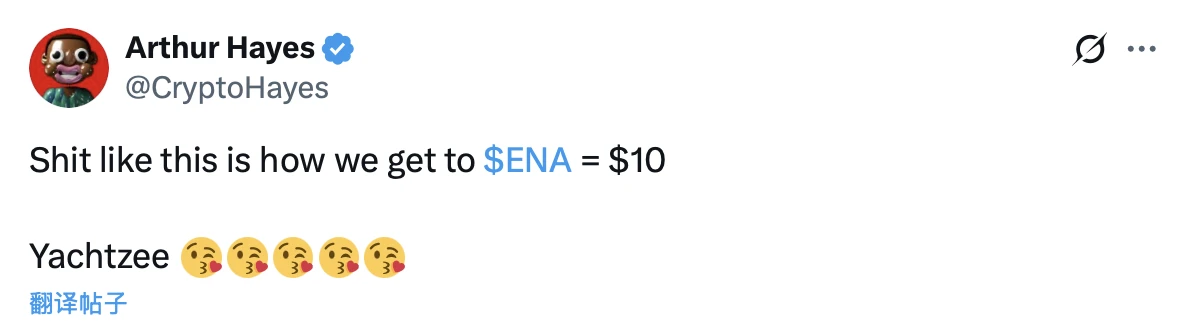 去年 12 月 21 日,Arthur Hayes 曾於 X 發文爆奶 Ethena(ENA),表示:「如果一個 DeFi 協議還沒有整合 USDe 或 sUSDe,那就該出局了。」
