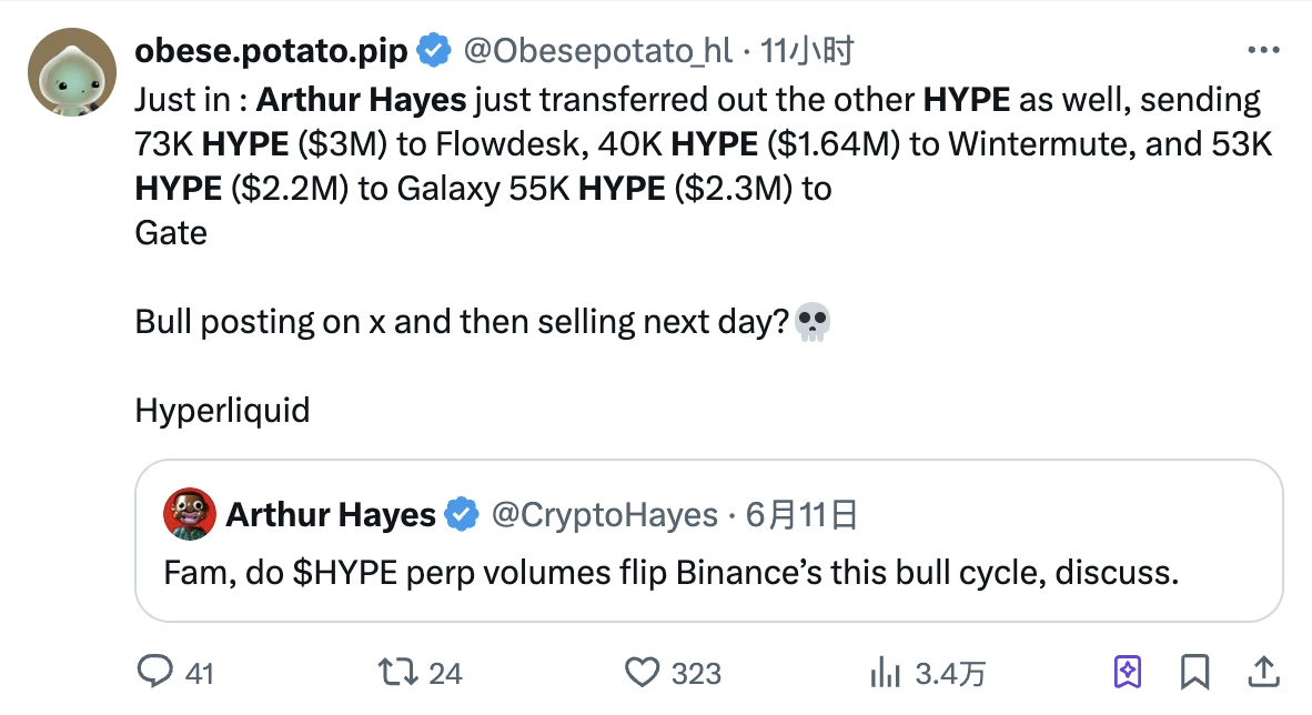 6 月 12 日,就在 Arthur Hayes 奶完 HYPE 僅僅一天之後,Hyperliquid 社群成員 @obese.potato.pip 在鏈上發現了一些有意思的動向 — Arthur Hayes 似乎正在拋售 HYPE。
