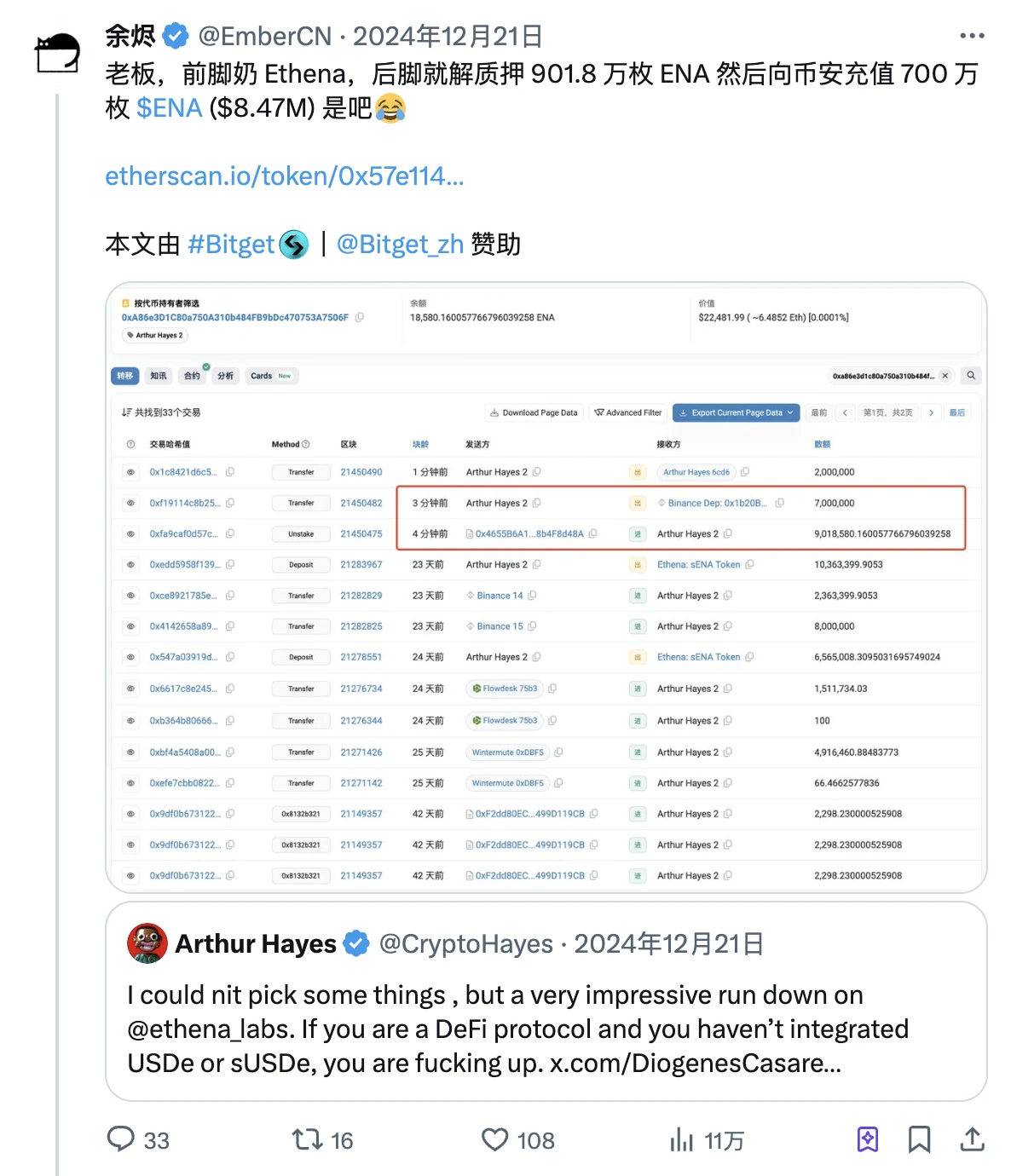 之後,Arthur Hayes 還曾向 Bybit 等 CEX 轉入近千萬枚 ENA 砸盤獲利。