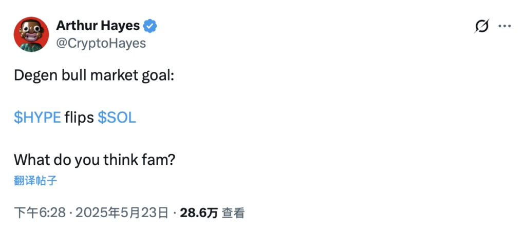 BitMEX 創辦人 Arthur Hayes 近期似乎 「愛」 上了 Hyperliquild(HYPE)。5 月 23 日,Arthur Hayes 在曾於 X 發文表示,其在本輪牛市中的目標或為 「HYPE 市值反超 SOL」。