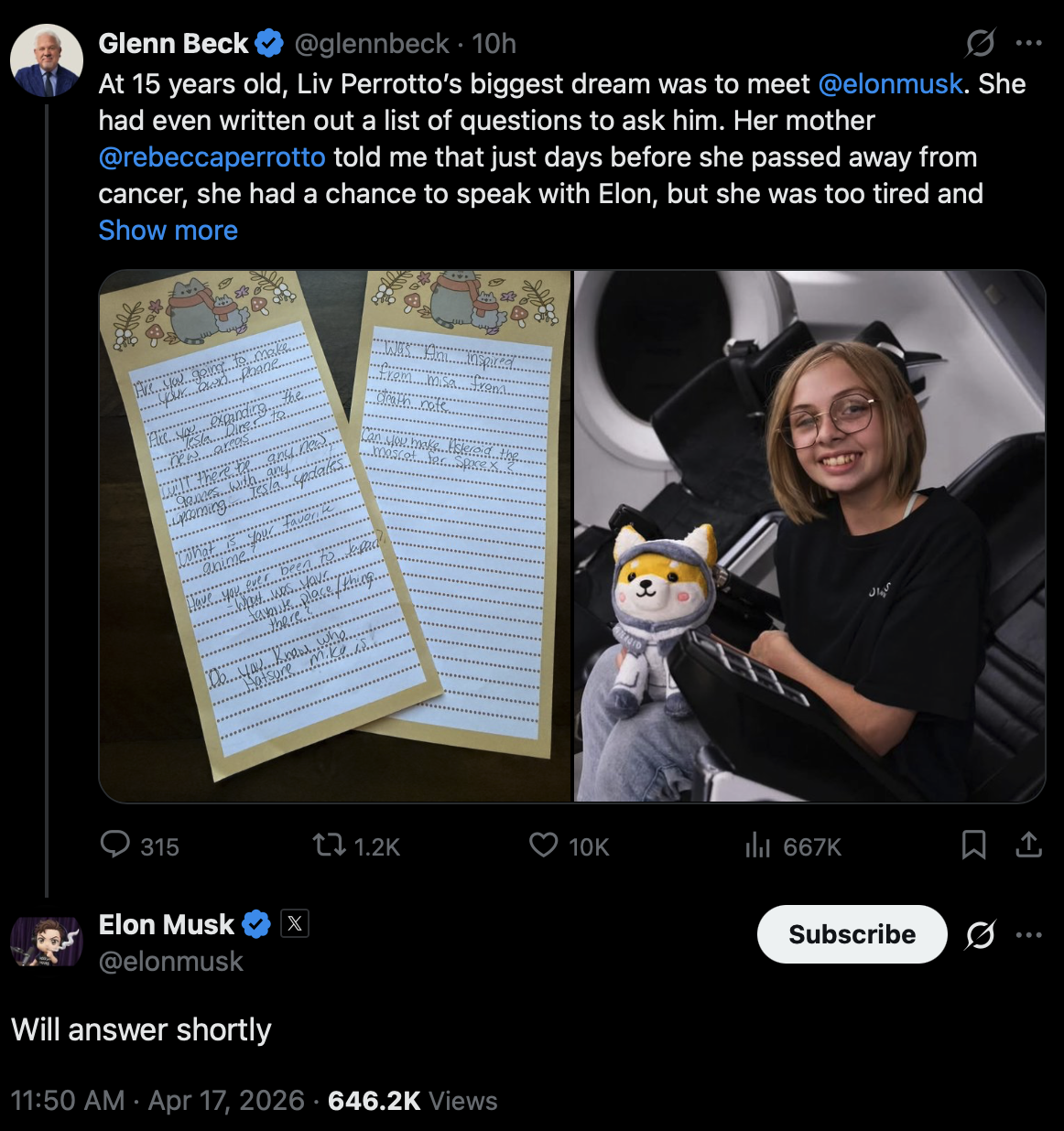 Liv Perrotto 罹患罕見癌症未分化肉瘤(undifferentiated sarcoma),去世前寫下一份想問馬斯克的問題清單,最大心願是能親自見到他。據其母親 Rebecca Perrotto 接受 Glenn Beck 節目的訪談,Liv 去世前幾天曾有機會與馬斯克通話,但她太虛弱,沒能說完心裡的話。
