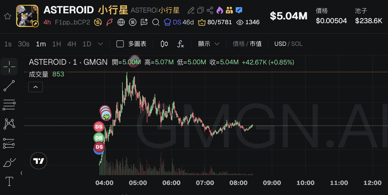 根據 GMGN,當前 ASTEROID (地址)市值回落到 500 萬美元左右,每枚 0.05 美元。迷因幣波動極大,請小心謹慎。