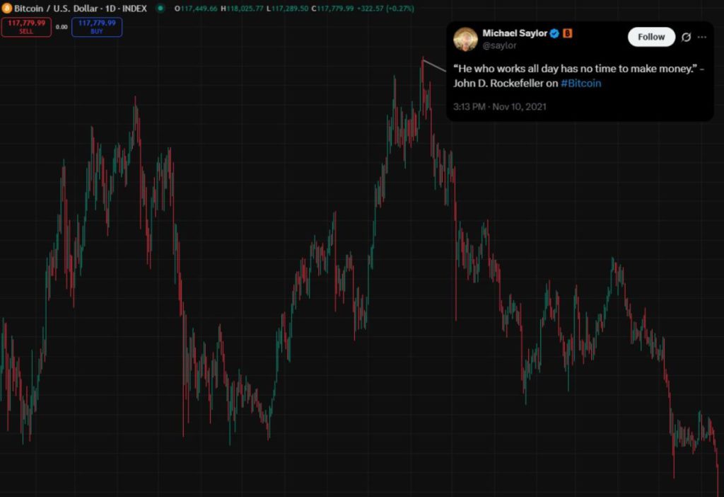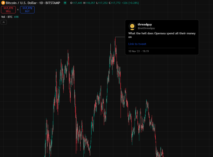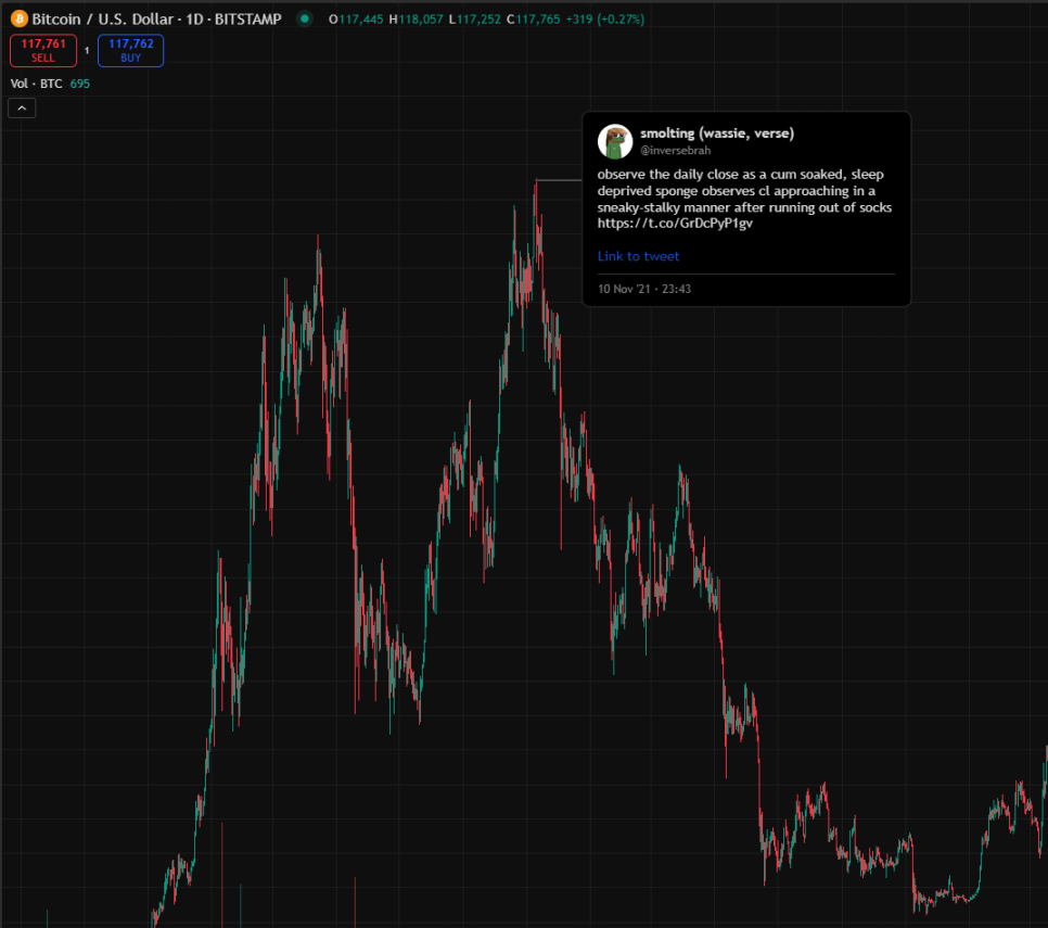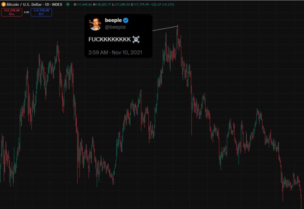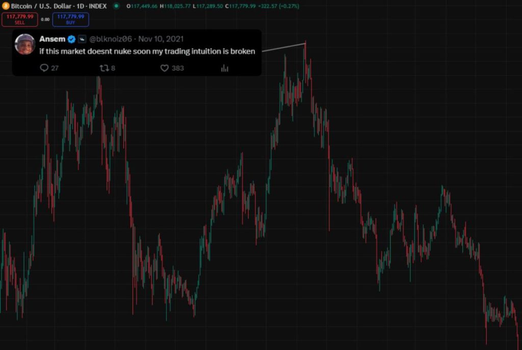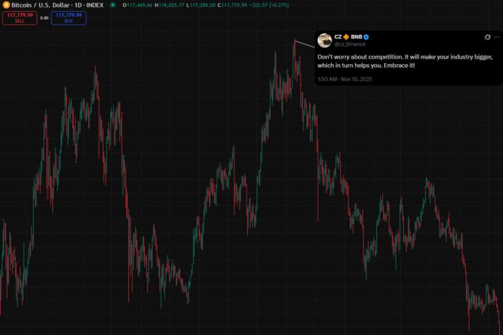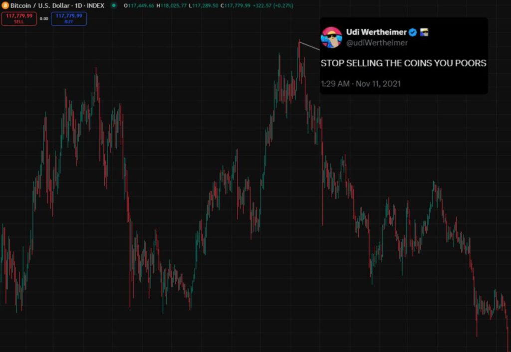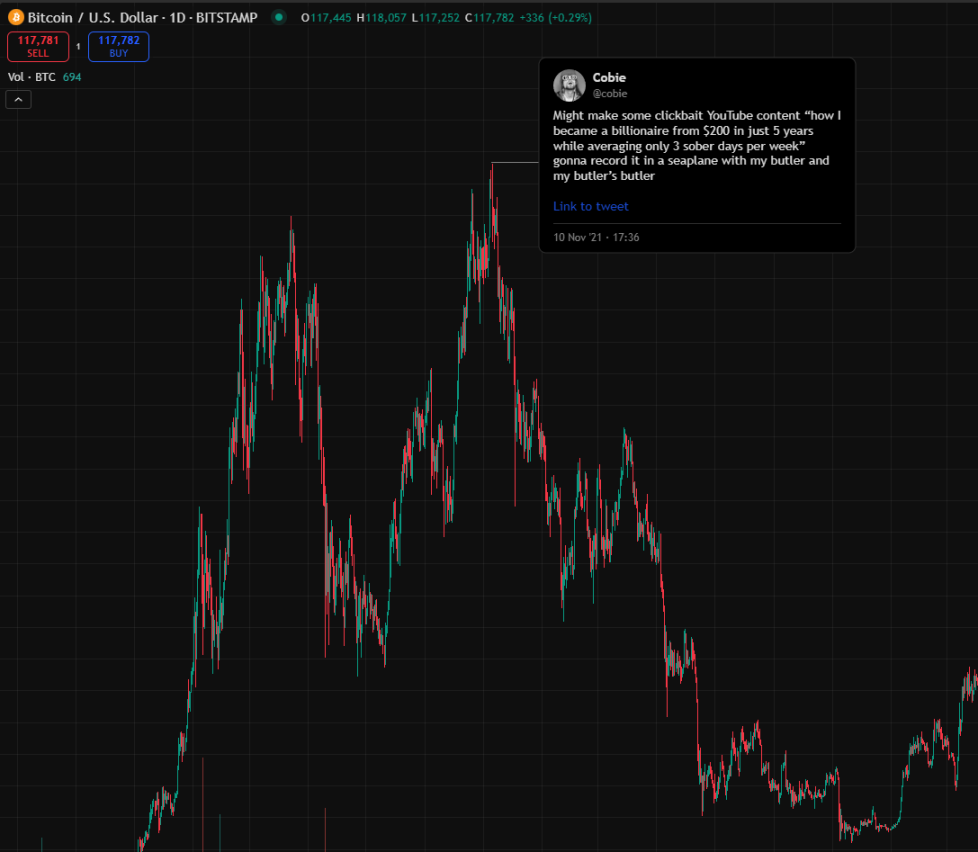 在歷史最高點時的推特資訊流看起來很瘋狂。要是連最厲害的人都沒法在頂部賣出,你也一樣做不到。做好相應準備吧。