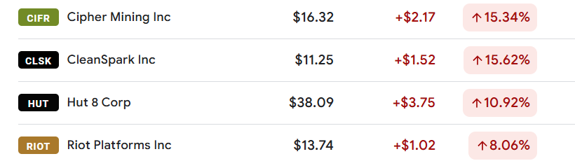 CoinDesk 特別指出,目前這一消息的最大受惠對象,正是已成功轉型為 AI 數據中心供應商的比特幣礦企。這些礦企擁有大量電力與機房基礎設施,正好符合 AI 訓練對高性能運算(HPC)的龐大需求。例如,Cipher Mining(CIFR)一度暴漲 18%、CleanSpark(CLSK)與 IREN(IREN)也上漲超過 10%;其他加密相關概念股如 Coinbase(COIN)、Galaxy Digital(GLXY)與 Bullish(BLSH)也同步上揚 4%-5%。
