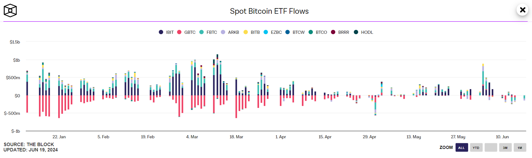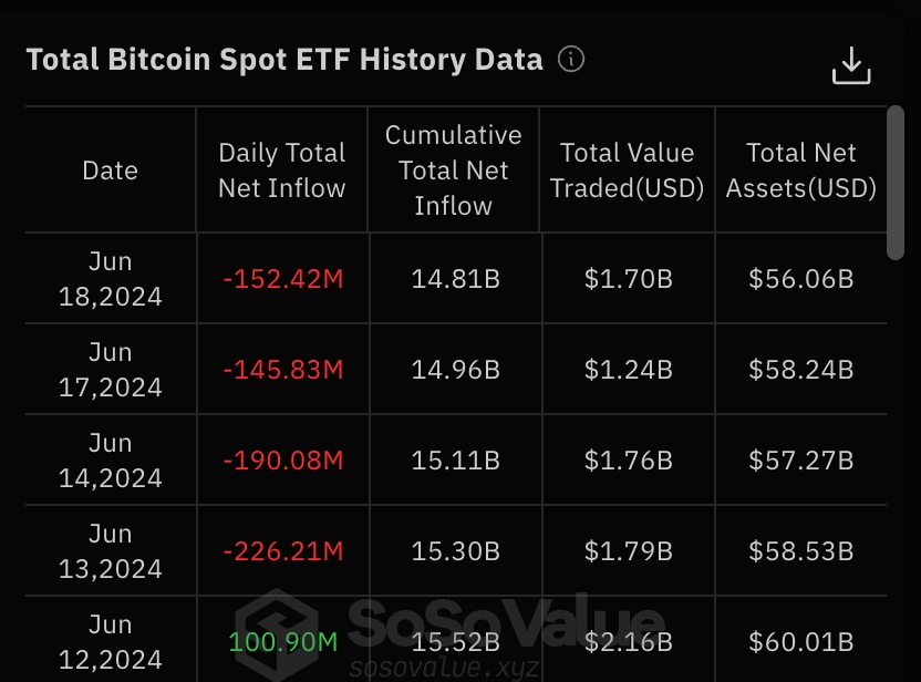 另一方面,美國比特幣現貨 ETF 的買盤表現也不佳。根據 Sosovalue 數據,截至 6 月 18 日,已是連續第四天資金淨流出。
